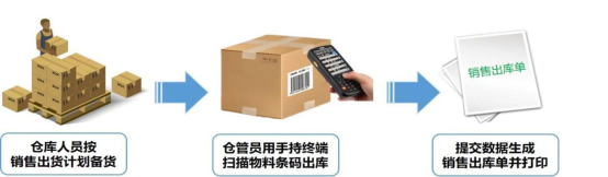 倉庫人員根據(jù)銷售人員的出貨計劃,安排銷售發(fā)貨。倉庫人員使用手持終端設(shè)備掃描源單發(fā)貨通知單,并逐一掃描成品條碼,確認(rèn)出貨數(shù)據(jù)無誤后,系統(tǒng)生成銷售出庫單。