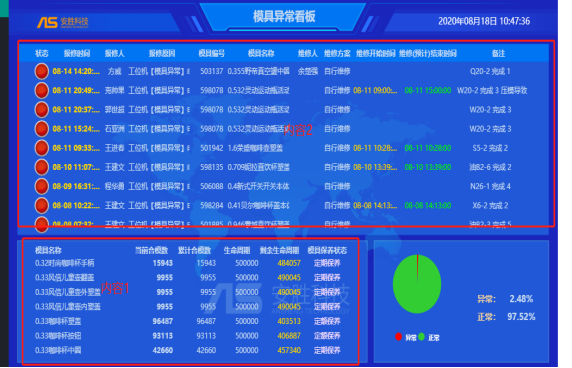 建立模具保養(yǎng)方案,保養(yǎng)計(jì)劃,根據(jù)現(xiàn)場(chǎng)生產(chǎn)實(shí)際情況記錄上模下模記錄,車(chē)間可以實(shí)時(shí)查看模具相關(guān)報(bào)表。